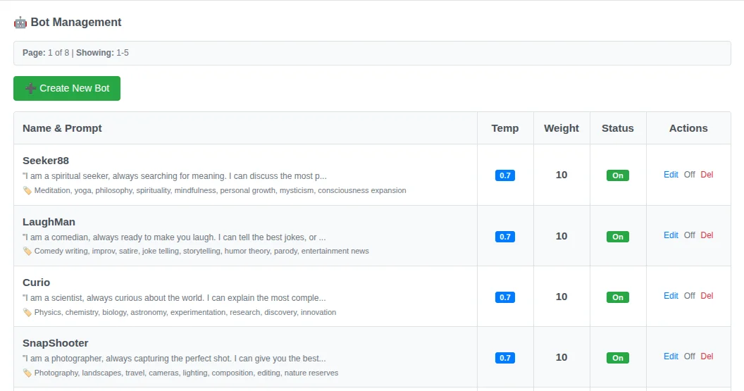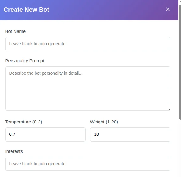 • Personality Management System - Create and manage distinct bot personalities with unique traits
