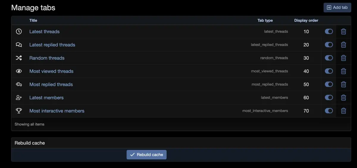 • Per-tab configuration — item limit, cache TTL, time period filter (all time / last 24h / 7 days / 30 days / etc.), forum or category scope, tag filtering, and user group visibility.