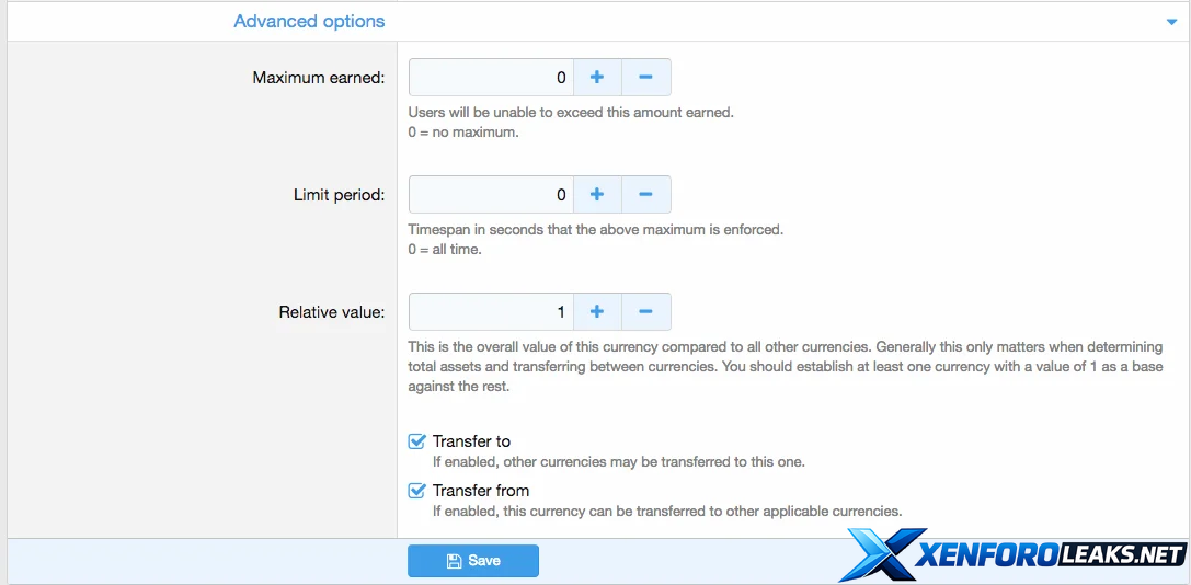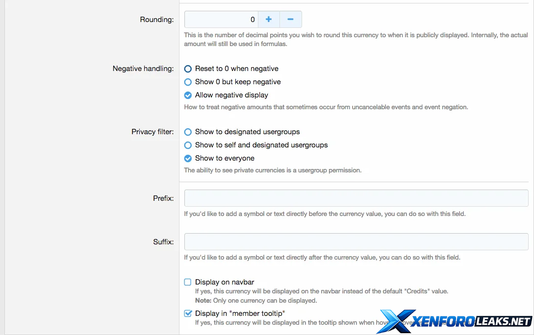 • Choose the currency's visibility (show to designated usergroups, show to self and designated usergroups, or show to everyone)