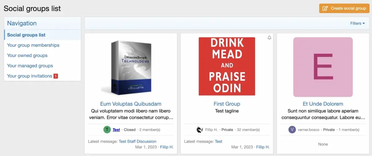 DragonByte Social Groups is a highly advanced social group management add-on for XenForo, containing advanced features such as fine-tuned permissions, a fully featured posting interface, and an invitation system.