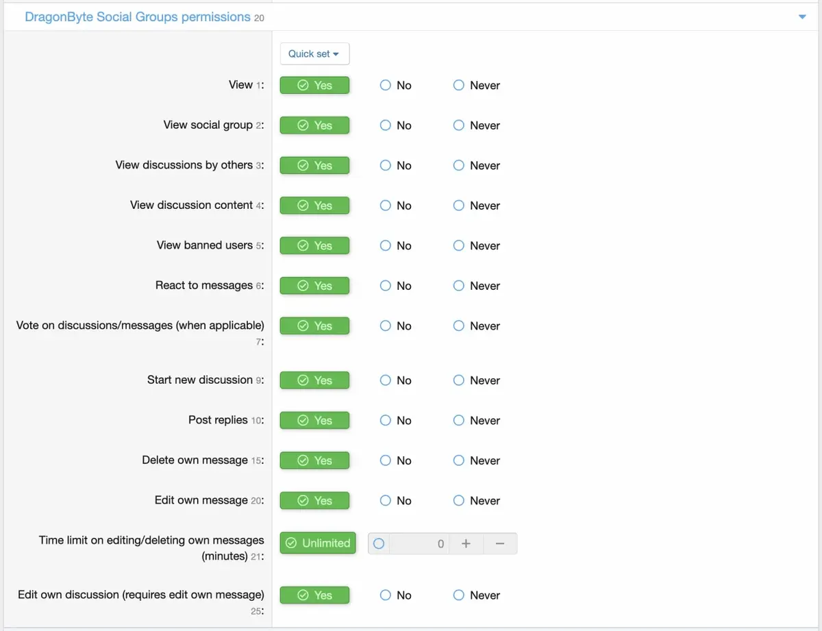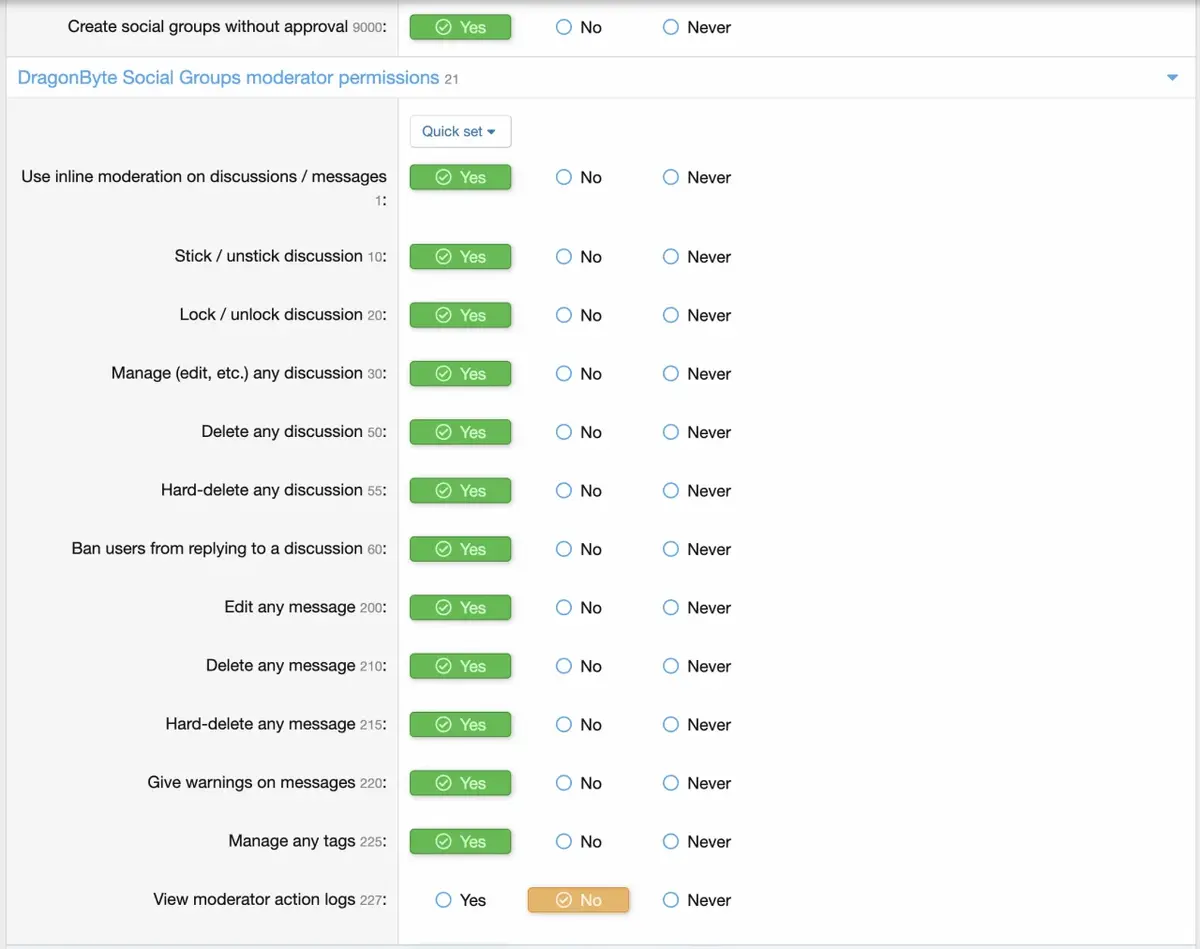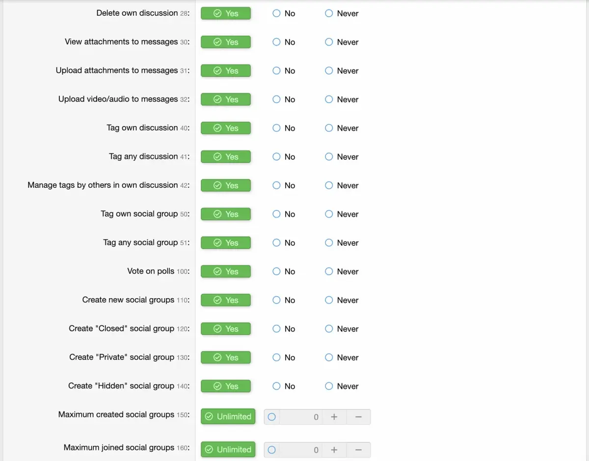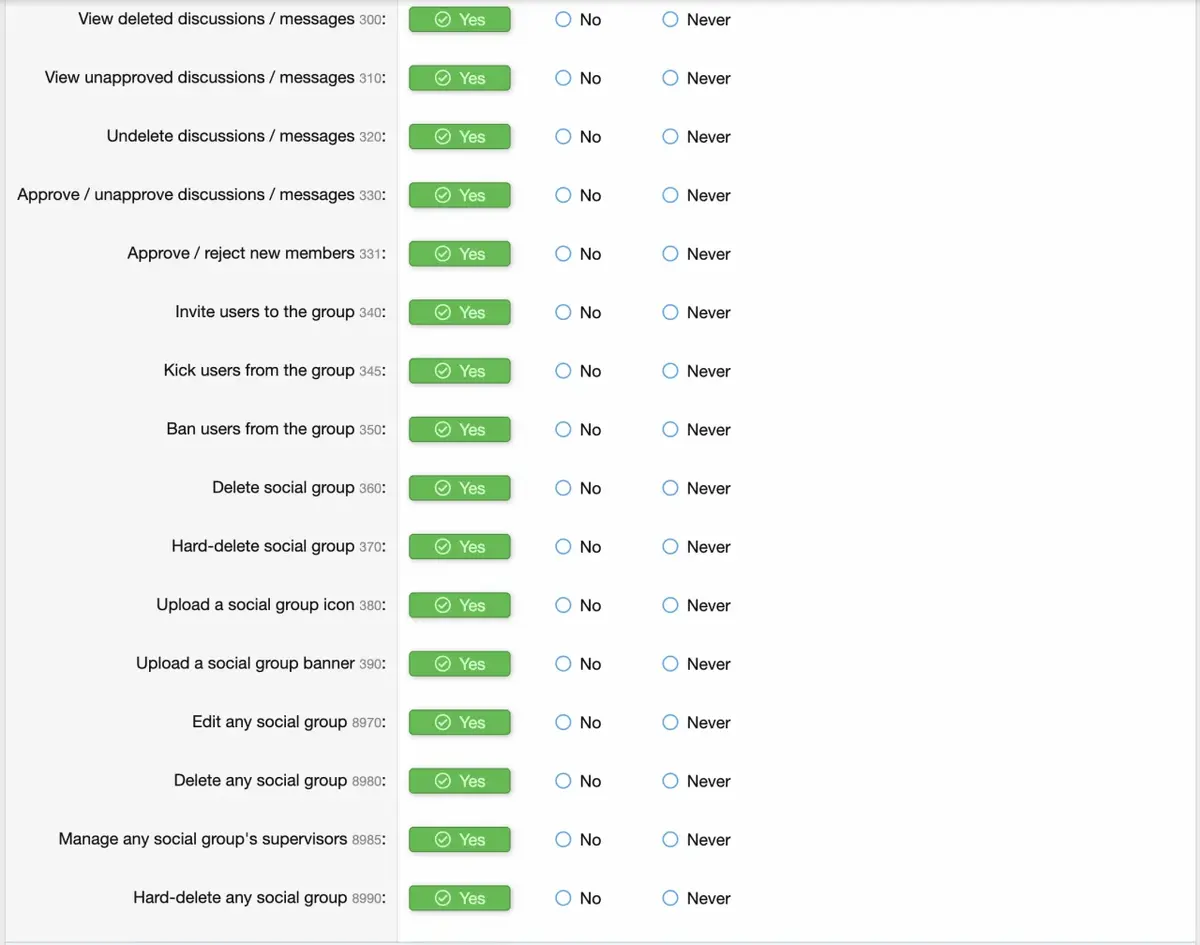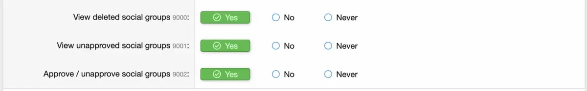 Fine-tuned permissions: Not only can you as the administrator control who can create social groups, and what privacy level they can add, but you can also control the permissions given to social group creators, and the maximum permissions they can delegate to their group supervisors. Don't want to allow hard-deleting content? Simply untick that permission from social group creators and supervisors while setting up the addon, and when it's time to go live, that permission will be closed off from them.