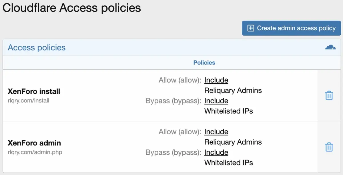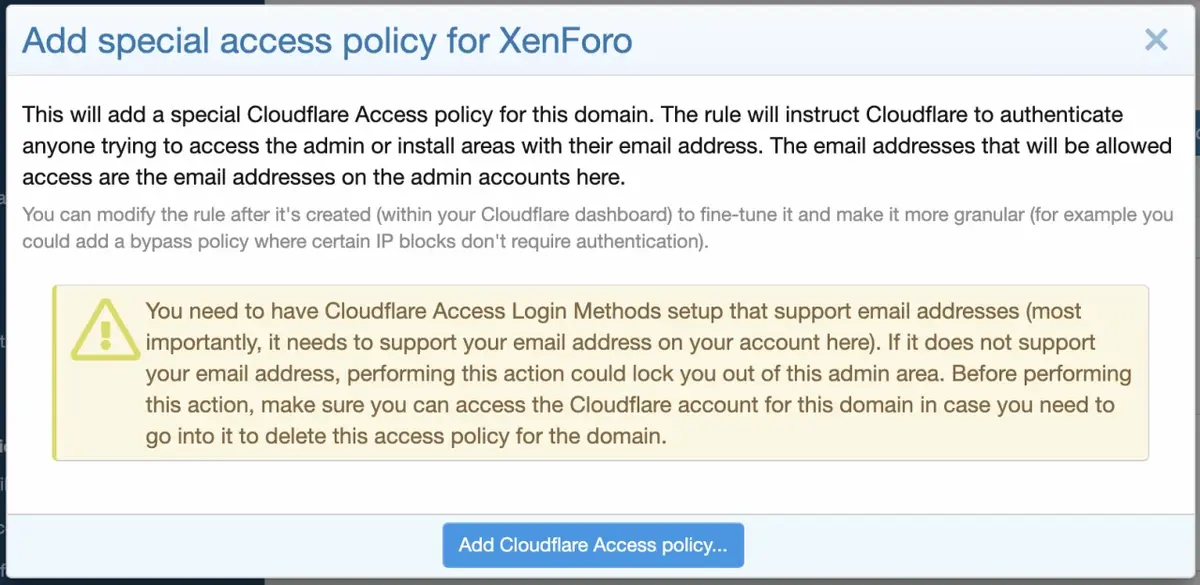 • You can automatically create Access policies to allow only admins the ability to access the install and admin.php URLs. You can also delete any existing Access policy.