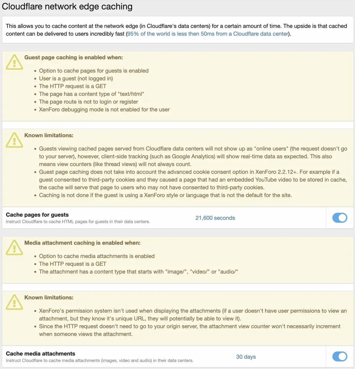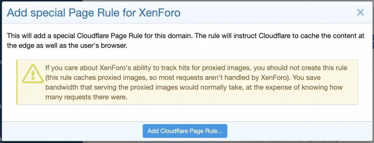 • You can automatically create a Page Rule that will instruct Cloudflare to cache images served through XenForo's image proxy (similar to XenForo's CSS, Cloudflare normally does not cache them because the image proxy uses .php extension).