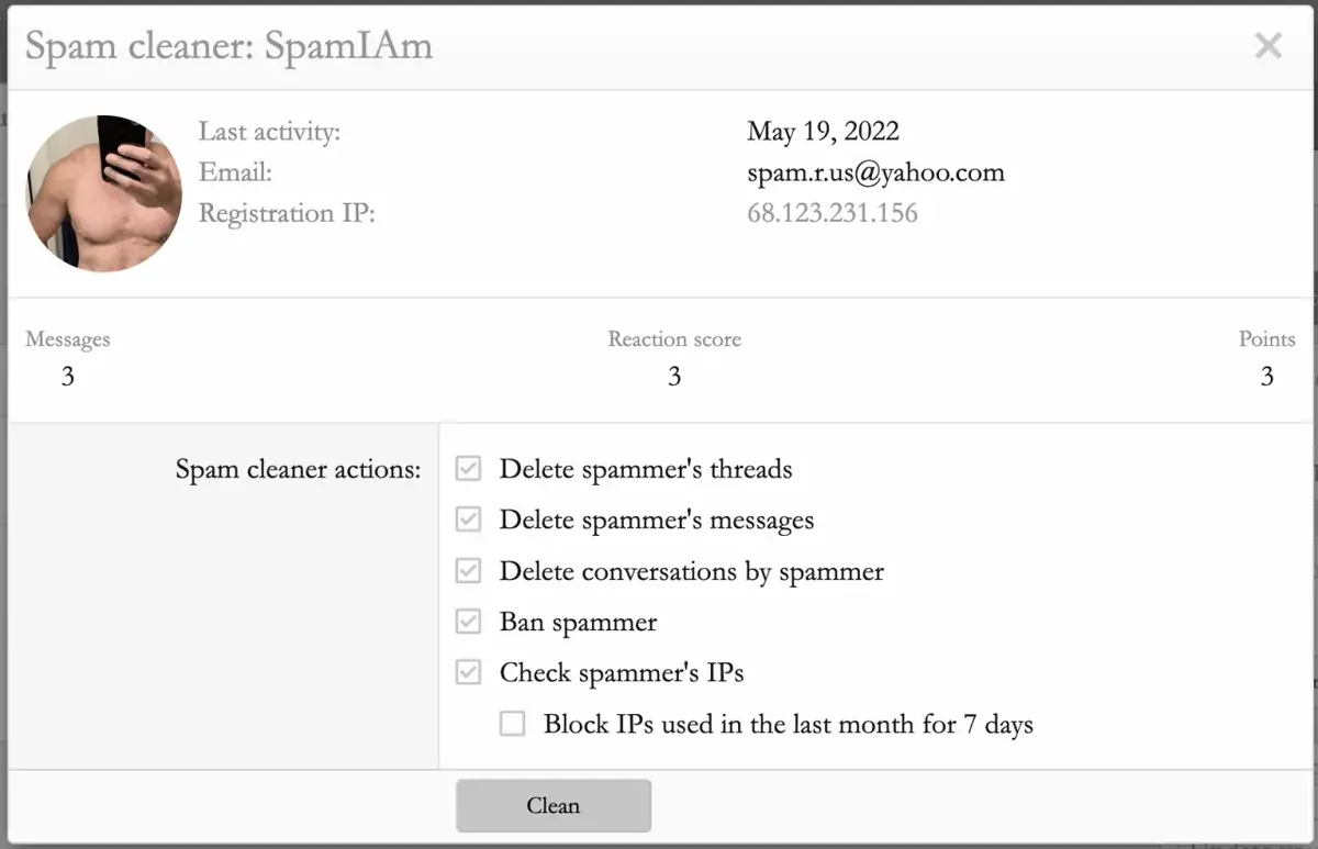 • Moderators that have the ability to spam clean and view user's IPs get an extra option in the spam cleaner where they can temporarily ban the IP address(es) the spammer used in the last 30 days. The number of days to ban is an option you can set in the admin area (it defaults to 7 days).