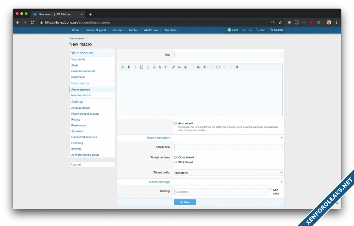 • Post Macros allows your users to define 'macros' that are available to use inside of the rich text editors on your board. These macros can have 'metadata' assigned to them, allowing them to perform actions such as setting the thread title when creating a new thread, or setting the thread prefix or lock/unlock state.