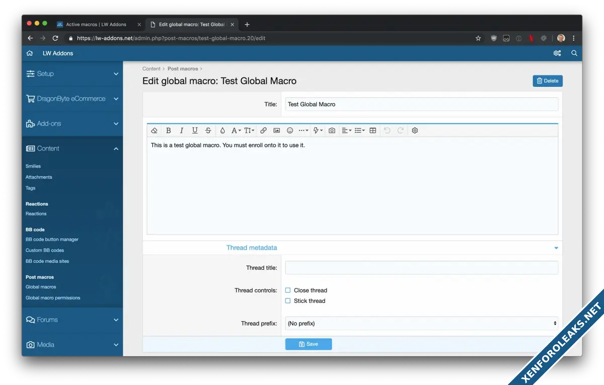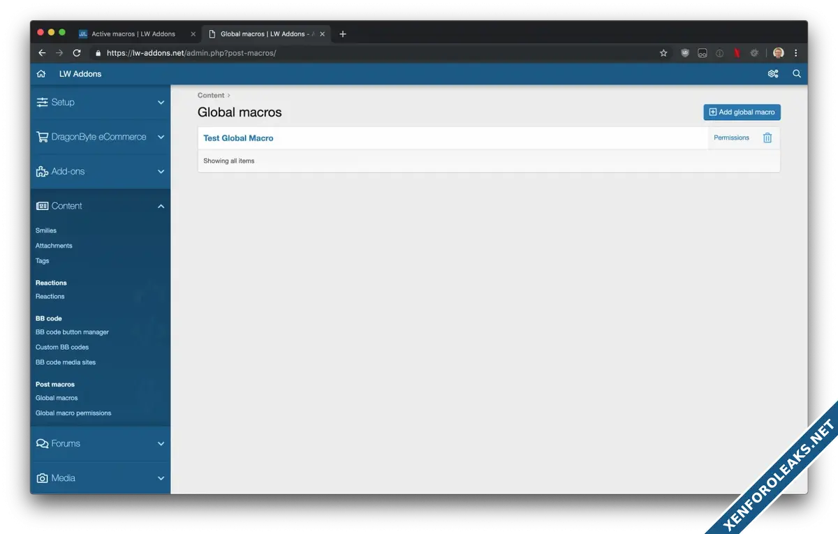 • Board administrators can also create 'Global macros', that are defined via the admin control panel, and available to users' with the relevant permissions - permissions for global macros use the standard XF permissions system, so fully support permission inheritance.