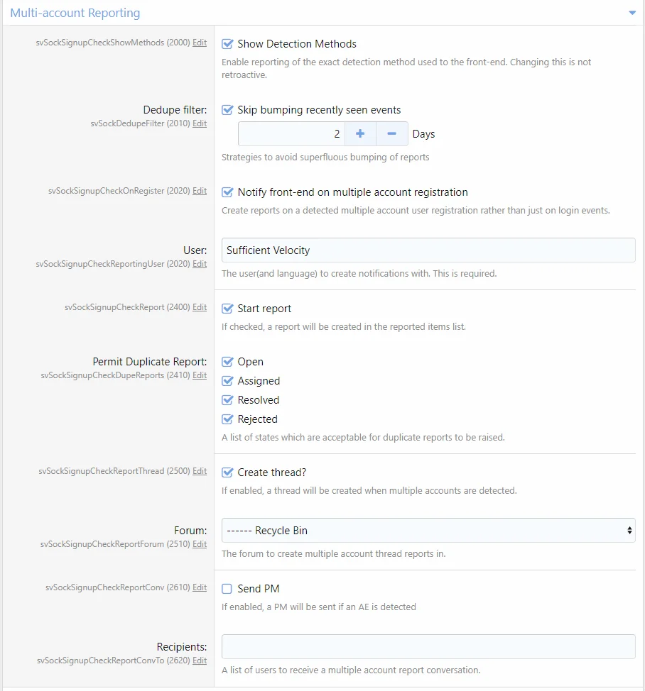 For multiple account detection, supports reporting to reports/threads. And will send reports to the same report/thread. To send to thread you must select the "Multi-account to thread" extra.