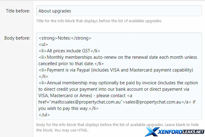 There are two information blocks you can add - one above and/or one below below the "Available upgrades" list. Both are optional - leave the body blank to hide the entire block.
