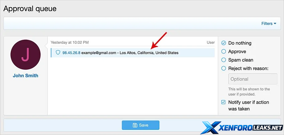 Shows IP location in approval queue.