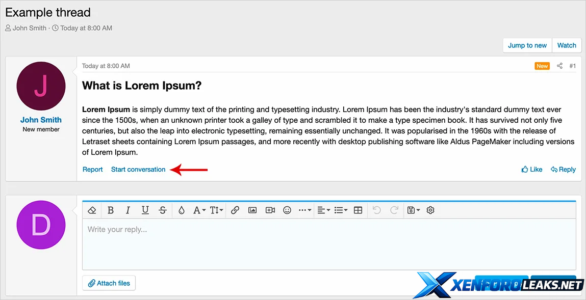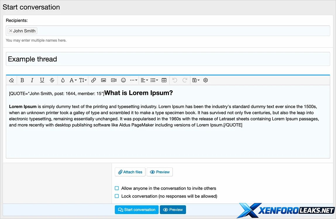 When the Start conversation link is clicked, it will automatically add the thread title and quote the post in the conversation. This allows the conversation recipient to quickly know which post the conversation is about.