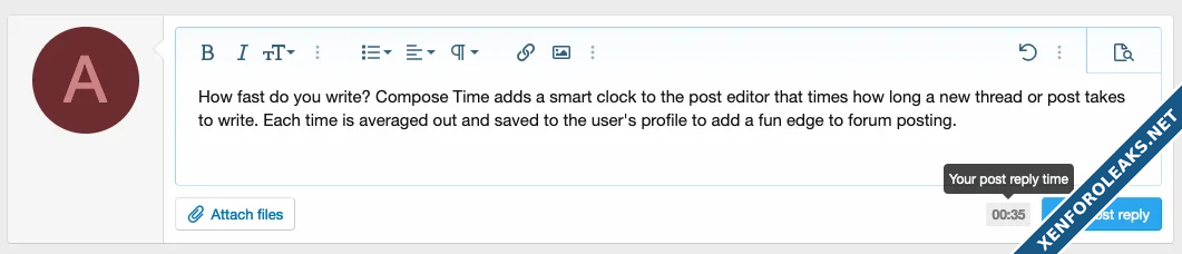 Compose Time adds a smart clock to the post editor that times how long a new thread or post takes to write. Each time is averaged out and saved to the user's profile to add a fun edge to forum posting.