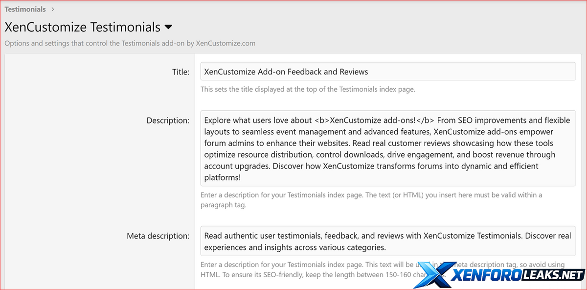 This update adds more customization and better visibility! You can now rename the index title, add a visible description, and set a custom meta description for better SEO. We’ve also improved activity tracking - users will now see proper “Who’s Online” activity when browsing testimonials.